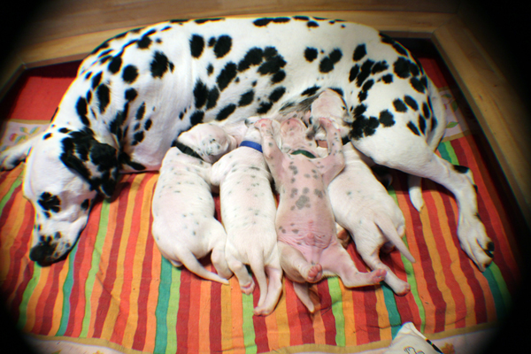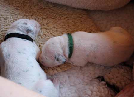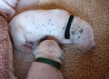 Halsband, der Zweitgeborene trägt grün, der dritte Rüde hat das schwarte