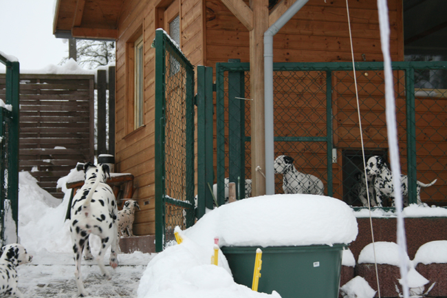 :-)" über den gefrorenen, glatten Boden hinter zum Hundespielhaus