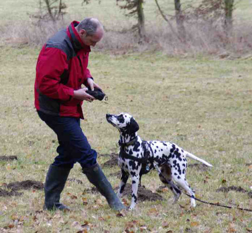 der Futterbeutel wird weggeworfen - sie muss sich merken wohin, und dann nach Aufforderung dorthin laufen, holen, dem Herrchen bringen - und dann gibt es Leckereien daraus - ist doch ganz einfach !! |